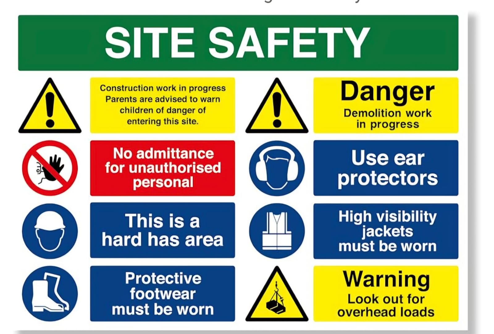 All-in-One Safety: Displays essential site warnings, including “No Admittance,” “Hard Hat Area,” and “High Visibility Jackets Must Be Worn”.
